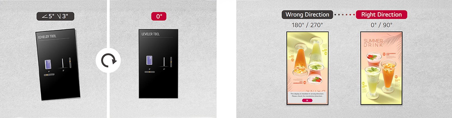 Wygodna instalacja z obliczoną precyzją Wyświetlacz XS4P o wysokiej jasności jest wyposażony w narzędzie Leveler Tool, które pokazuje użytkownikom nachylenie urządzenia, umożliwiając precyzyjną instalację wyświetlacza. Dodatkowo narzędzie Horizontal Sensor Tool pomaga użytkownikom w sprawdzeniu prawidłowego kierunku instalacji. Wyświetlacz XS4P skierowany w stronę okna wyświetla nawet komunikaty ostrzegawcze dotyczące prawidłowej instalacji, jeśli jest zainstalowany nieprawidłowo. |
