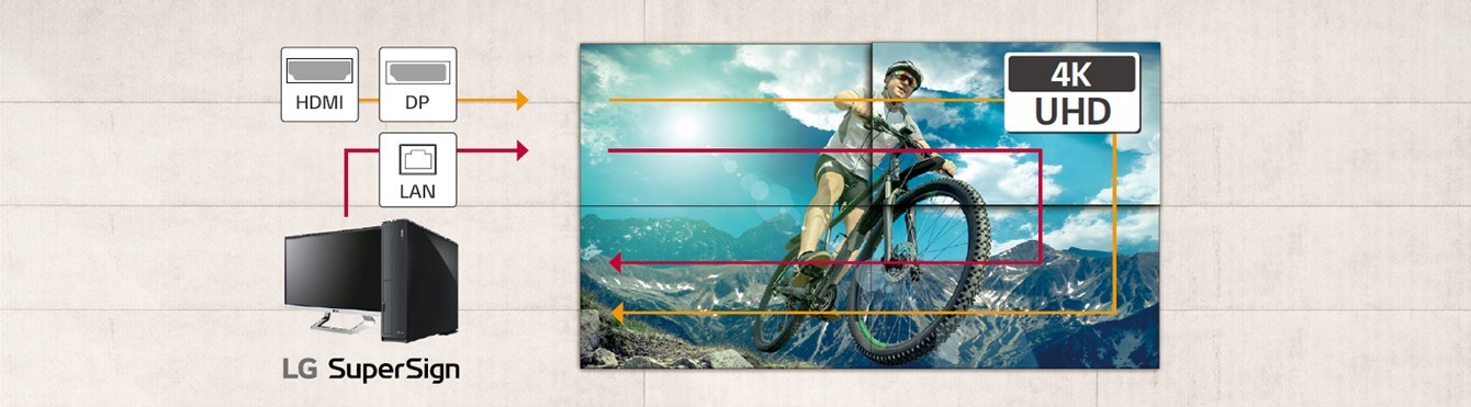 Możliwość połączenia łańcuchowego Łańcuchowe połączenie LAN umożliwia sterowanie i monitorowanie wyświetlaczy ściany wideo, a nawet jednoczesną aktualizację ich oprogramowania układowego. Ponadto dzięki łańcuchowemu połączeniu UHD za pomocą HDMI i DisplayPort można łatwo skonfigurować ścianę wideo UHD bez konieczności stosowania DisplayPort MST lub karty graficznej Matrox. |