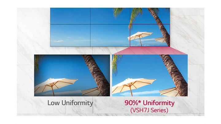 Jednolite odwzorowanie kolorów Niska jednolitość wokół krawędzi ramki może powodować ciemniejsze rogi, co nie wygląda dobrze na dużym ekranie. Jednak seria VSH7J charakteryzuje się zwiększoną jednolitością, nawet w czterech rogach wyświetlacza ściany wideo, zapewniając żywe i spójne kolory na całym ekranie. * Jednolitość w 13 punktach ekranu. Wyniki oparte na testach wewnętrznych. Rzeczywiste wyniki testów mogą się różnić w zależności od środowiska i sprzętu pomiarowego. |
